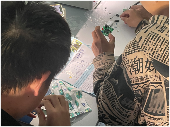 李阁老师先给大家每人发了一份实验套件,为大家介绍了里面的元件的名称和特点,大家经过学习,能够对不同元件进行区分,并准确读出其参数。然后,老师为大家介绍了如何将元件焊接在电路板上,并进行了示范。同时老师强调了使用电烙铁时要注意安全,避免烫伤。大家也在老师的指导下,自己动手进行焊接操作,在实践中体会到了乐趣。最后,李阁老师介绍了电路功能调试的方法,大家看着自己制作的电路能够正常工作,都非常高兴。