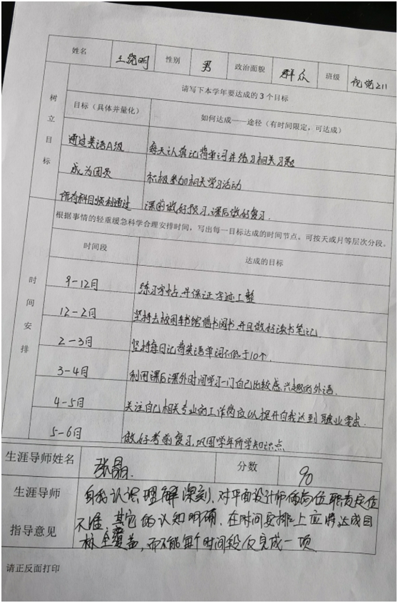 此次新生学年学习规划指导由8名生涯导师分别带领41名学生,共分为“自我认知、了解专业、树立目标、时间安排与填写学习规划表”五方面。教师们首先对同学们进行具体指导,他们在指导中指出“自我认知与定位在学年规划中起到相当大的作用,无论是现在的学习还是以后的就业,只有自我了解明确了、自我定位准确了,才能树立准确且实际的目标并扎扎实实的完成它。”指导过后又让学生们填写了学年学习规划表,并由各自指导教师评分。学生们在指导中不断完善和丰富自己的学习规划表,纷纷表示通过此次指导与评分,明白了规划在学习中的重要性,今后也会按照自己制定的学年学习规划表来严格要求自己。
