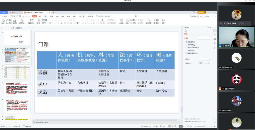 会议开始,刘春媛首先讲述了此次汇报会的形式,和汇报的顺序。随后,各小组负责人对小组讨论结果进行讲述,将办学特色的讨论内容通过PPT的形式展示出来,各小组的课件内容十分丰富,可以看出是认真思考讨论出的结果。六个小组汇报完后,刘春媛进行了总结,也指出了纯在的不足。
