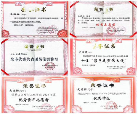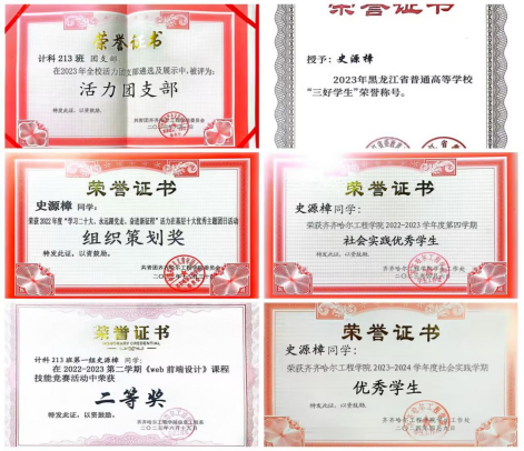 在校期间,史源樟同学多次获得校级奖学金及国家励志奖学金,并多次获得校级及以上荣誉称号。曾被评为黑龙江省三好学生、齐齐哈尔市优秀共青团员,并在“齐齐哈尔工程学院办公软件应用技能竞赛”中荣获三等奖,获得“学习党的二十大、永远跟党走、奋进新征程”活力在基层十大优秀主题团日活动组织策划奖,在2022-2023学年度第二学期无偿献血活动中荣获“优秀志愿者”称号。在校期间,积极参与并组织多次团学活动,充分展现了其全面发展的优秀素质及其对更高目标的不懈追求。