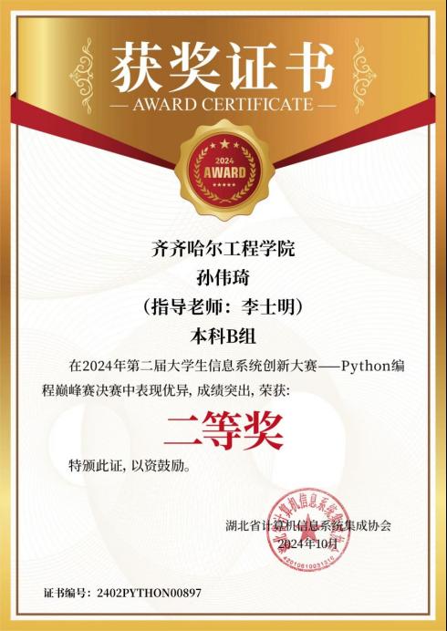 孙伟琦:我始终保持着对知识的渴望和对生活的热爱。学校为我们提供了丰富的实践机会和浓厚的学习氛围,我积极参与各类校园文化活动、专业实践和社会实践,将所学知识用于解决实际问题。同时,我也热衷于参加专业技能竞赛,如2024年第二届大学生信息系统创新大赛——Python编程巅峰赛、第五届“行业-专业-就业”大赛等具有影响力的赛事。这些经历不仅提升了专业技能,还锻炼了团队协作能力和创新思维。