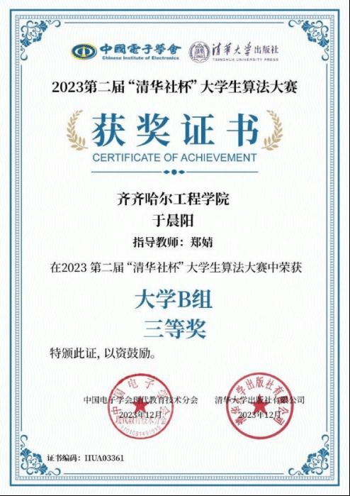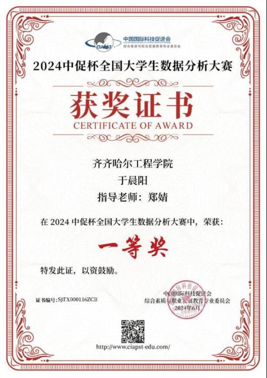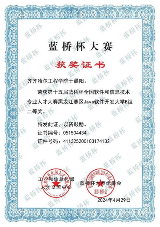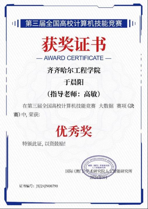 于晨阳,作为齐齐哈尔工程学院信息工程系2025届数据科学与大数据技术专业的优秀学生,在校期间积极参加校内外专业竞赛多次,实践动手能力较强,现就职于无锡专心智治科技有限公司。