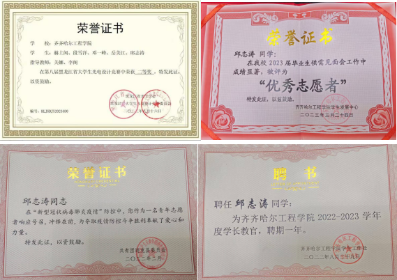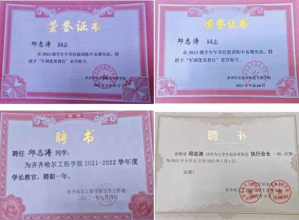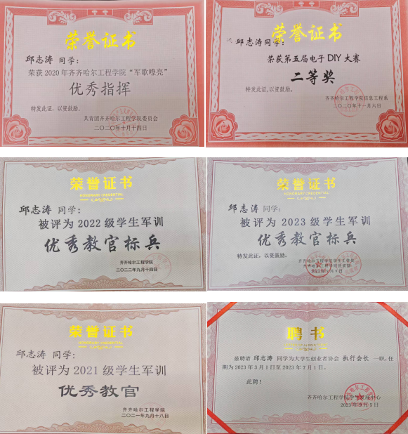 在竞赛领域,他荣获第八届黑龙江省大学生光电设计竞赛二等奖,以及在第五届电子DIY大赛中摘得“二等奖”,这些荣誉是对他创新思维与实践能力的最佳证明。此外,邱志涛在齐齐哈尔工程学院“军歌嘹亮”活动中,以其卓越的领导力被授予“优秀指挥官”称号,展现了非凡的军事素养与指挥才能。