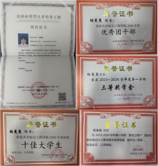 杨曼曼,齐齐哈尔工程学院信息工程系2020级视觉传达设计专业毕业生。在校期间,她担任班级团支书一职,荣获“优秀团干部”“十佳大学生”等荣誉称号,并多次斩获奖学金。2024年7月毕业后,杨曼曼入职黑龙江乳业有限责任公司,担任工业旅游专员一职。在工作中,她始终保持积极向上的工作态度,赢得了领导与同事的广泛赞誉。