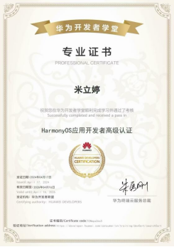在学习上,米立婷在校期间成绩优异,无挂科情况,并获得四次校级二等奖学金,两次校级三等奖学金。同时,她还考取了数据分析专业技能证书、OceanBase数据库V3数据库认证专员以及HarmonyOS应用开发者初级和高级认证。