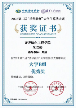 米立婷积极参加各类专业竞赛。获得2023第二届“清华社杯”大学生算法大赛优秀奖,第四届全国大学生数据分析科普竞赛系列活动之理论赛一等奖,2025计算机能力竞赛暨城市联赛-计算机素养赛道优秀奖。
