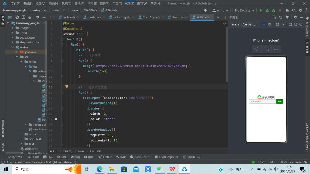 这周专业实践的指导老师是杨默老师,杨默导师是一位很有耐心的老师,第一天开始带我们安装Code,DevEco Studio软件,给予我们思维和理解。通过杨默导师的讲解让我了解到Code工作对于公司业务的重要性以及所面临的挑战。也了解了DevEco Studio 作为一款面向华为鸿蒙操作系统的集成开发环境(IDE),具有强大的功能和广阔的应用前景。我们小组花费了大量时间和导师同事学习内部的代码库和文档,逐渐理解了项目的架构和业务逻辑。目前已经利用Code做出了模块的各种排版以及制作购物车界面,还用DevEco Studio 制作360网络搜索界面。虽然过程中遇到了一些小挫折,比如环境变量配置错误和代码语法的疏漏,但在导师和同事们的耐心指导和帮助下,我顺利地解决了这些问题,并成功地运行了第一个鸿蒙应用。