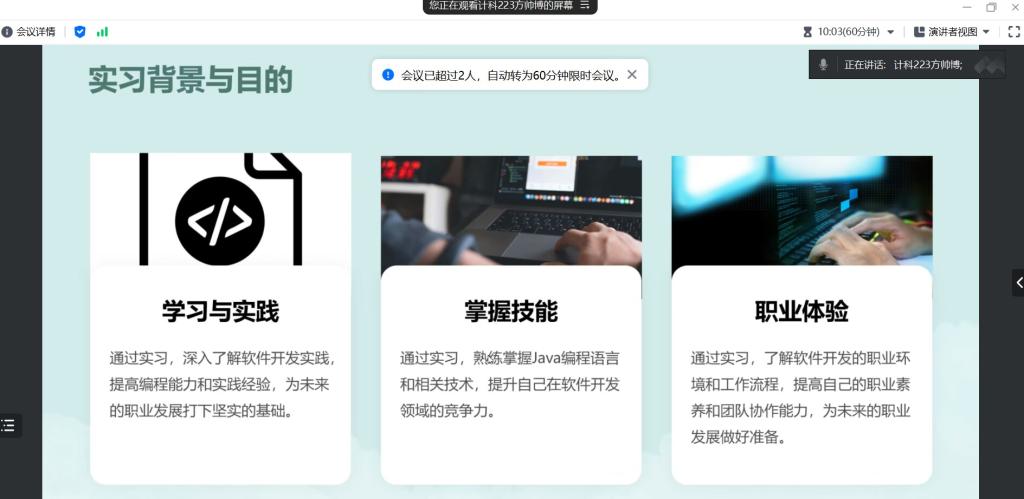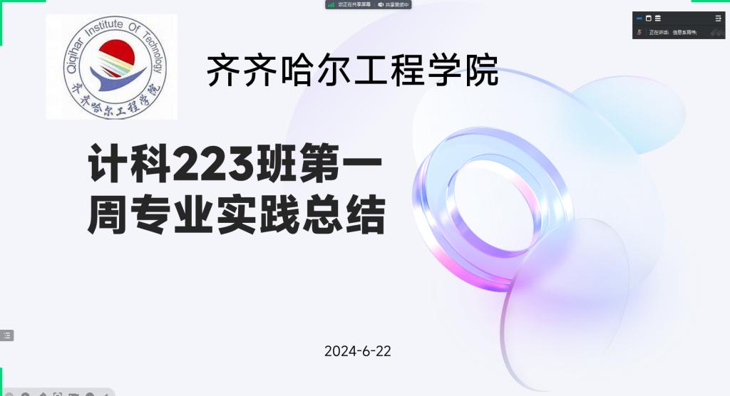 6月22日,计科223班利用腾讯会议召开了第一周专业实践学期总结会,此次会议旨在回顾和总结同学们在专业实践学期中的学习成果和经验,同时展望未来的学习和发展方向。会议由杨学仁老师主持,计科223班全体成员参加。