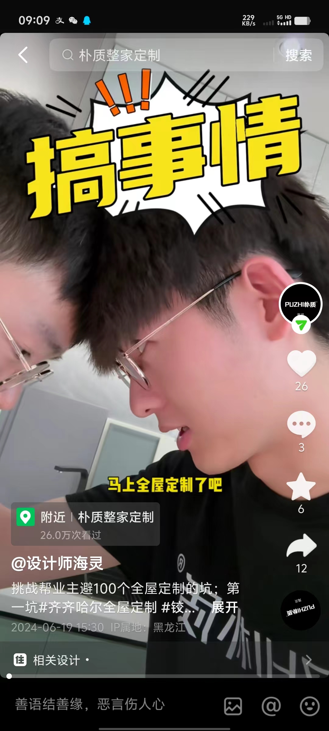 视觉传达设计专业共两名学生在校企合作单位朴质整家定制齐齐哈尔市龙沙区朴质整家定制营业部开展专业实践学期学习,任务内容为全屋定制短视频文案的撰写与拍摄。截至6月20日,学生文案成功被企业采纳,并在该企业设计师海灵抖音平台发布。