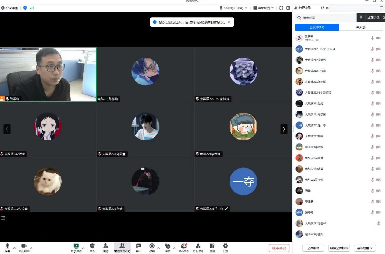 各小组负责人对本学期的社会实践活动的进展情况进行分享,大部分同学们已经完成各项任务了,张老师督促没有完成的同学们尽快完成任务,在开学之前把各项任务、工作都落实好。然后张老师提醒同学们要注意调整作息时间,尽量早睡早起,不要睡懒觉,这样对身心都好。接下来,张老师提醒同学们准备好关于补考的相关工作,争取一次就过。还有要时刻关注班级群里边的返校信息填写,以及选课的情况。张老师也鼓励大家积极参与三月份的计算机等级考试。最后张老师通知了,会有一些线下家访的情况,希望同学们做好准备。