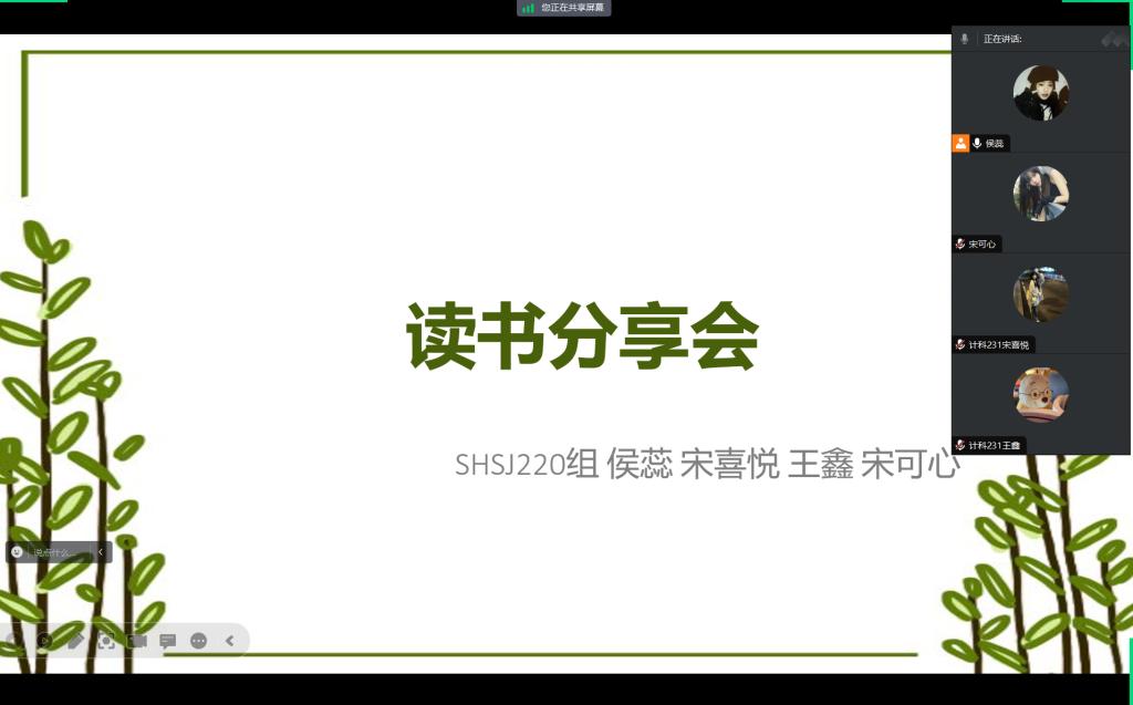 1月31日,SHSJ220小组开展第一次读书分享交流会,分享会以线上视频的形式开展,SHSJ220小组全员共4人参加。