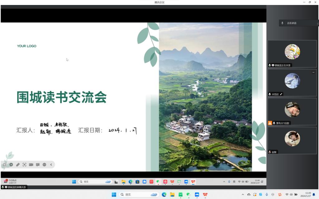 1月27日中午,第四学期第四组通过线上腾讯会议的形式召开了读书分享交流会,本次分享会由第四组组长田甜同学组织,团队成员赵敏同学,米恬欣同学,穆婉滢同学全部参与此次分享会。