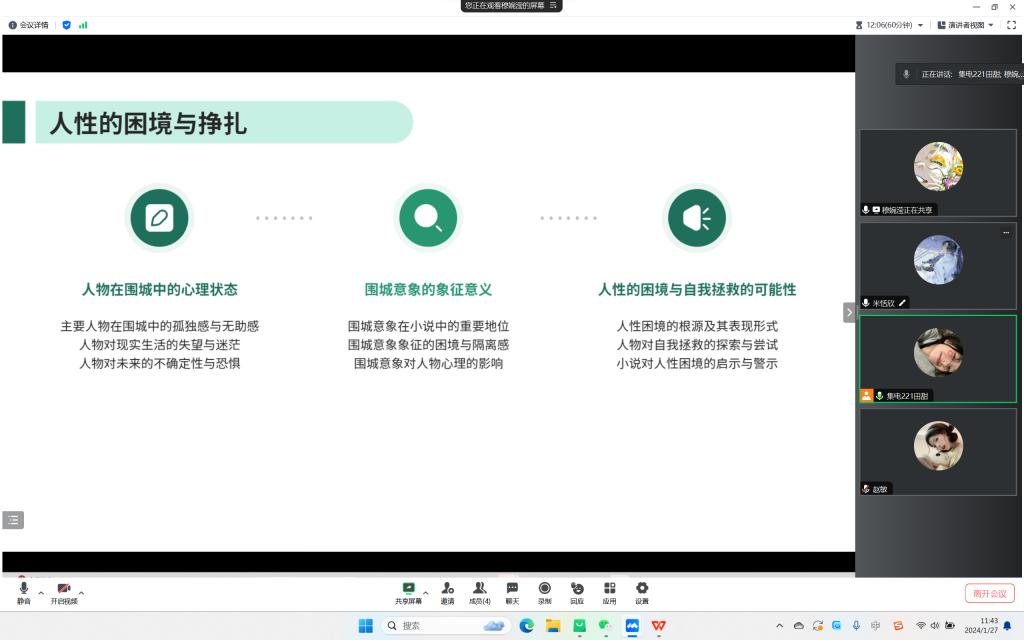 本次分享会以《围城》这本书为中心,展开进行交流。首先,田甜同学表示《围城》是钱钟书的一部著名小说,以独特的讽刺手法和深刻的社会洞察,揭示了人生和社会的复杂面貌。随后,穆婉滢同学表示读完《围城》这本书后,深感其对社会现象和人性的揭示的深刻,小说中的人物形象鲜明,行为和思想都深深地反映出了当时社会的现实和人性的弱点。在不断的揭示下,和钱钟书在本书中的幽默,讽刺的写作手法下,使本书内容更加炫彩。最后,通过本书,第四组组员深深地感受到了人生的不易,社会的复杂和人性的弱点。