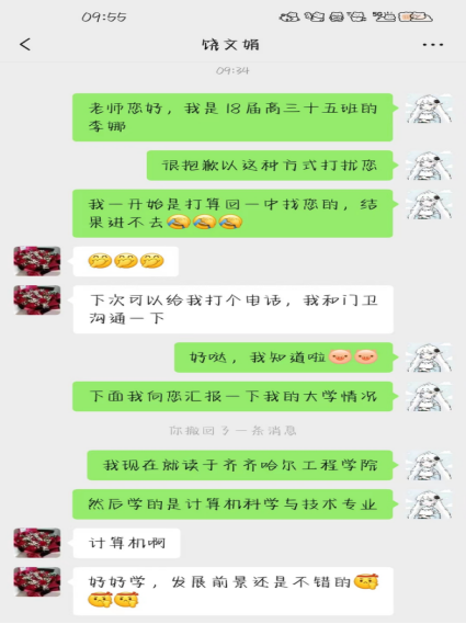 2024年2月19日上午,计科211班李娜回访母校东乡区第一中学,由于门卫拒绝了进校要求,于是在微信上对高中数学老师饶文娟进行回访。