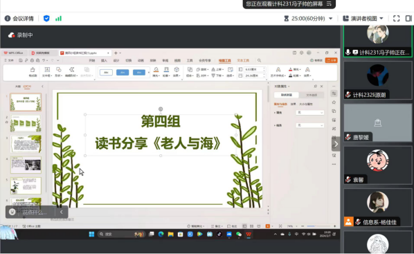 首先,第一组的唐黎媛同学向大家介绍了她在社会实践学期阅读的书籍《活着》,《活着》是余华老师的经典作品,唐黎媛同学先后介绍了这本书的创作背景和时代意义以及自己读完这本书的收获感悟。其次,袁馨同学向同学们介绍了《三毛流浪记》,袁馨同学通过介绍作者的生平经历和一段《三毛流浪记》的节选视频来让同学们更好的感受这本书。然后,三组的高静文同学介绍了《杀死一只知更鸟》并完整详细的介绍了她推荐的原因,并在介绍这本书的末尾分享了经典段落和她的感悟。接着,四组的冯子帅同学和五组的李源潮同学介绍了同一本书《老人与海》,两人都生动介绍了作者海明威和故事情节并在最后说出了自己在读完这本书后的感悟。最后,第六组同学也认真向大家介绍了他们在社会实践学期内读的书,并向同学们展示了他们在书中获得的感悟。