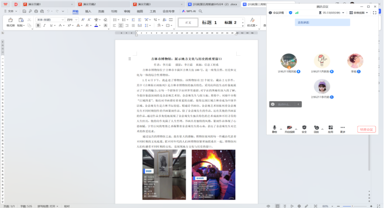 会议中,成员各自详谈对博物馆的直观感受。周洪旭在参观博物馆的过程中,感慨中国的历史,博物馆是中国历史的一条记忆轴,串联着不同的历史时期,感受中国古代的智慧。齐跃彤认为在博物馆中漫步,仿佛穿越时空,像是与过去的文明进行对话,精心布置的展览能够使观众身临其境地感受博物馆历史的魅力。李旭、李月茹则认为博物馆是学校教育的重要补充,为观众提供了学习和思考的空间,从而激发了人们对知识的渴望。与此同时,小组成员对博物馆提出了发展期望,希望博物馆更加注重与观众的互动,用创新的科技手段吸引更多年轻人走进博物馆,让博物馆成为人们生活中不可或缺的文化场所。