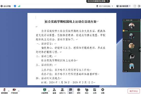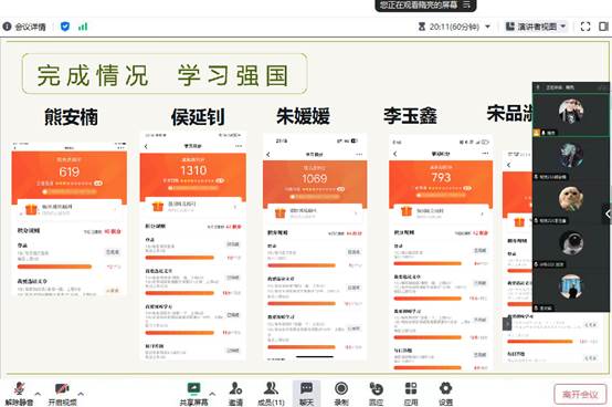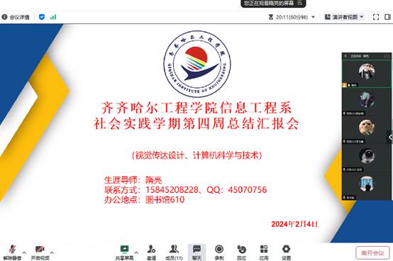 2月4日,党委宣传部生涯导师隋亮通过腾讯会议在线组织了社会实践学期第四周总结汇报会,SHSJ246李文铭小组和SHSJ247朱媛媛小组共10名学生全体参会。