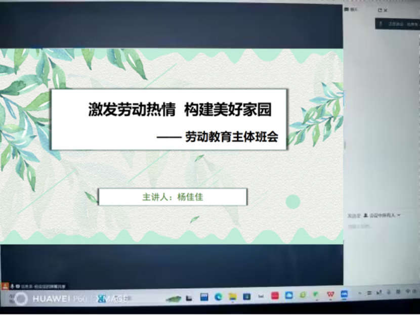 首先杨佳佳老师讲述劳动教育的意义,强调了劳动教育的重要性,并提出劳动教育的核心是培育学生的责任感、合作精神和实践能力。其次,杨佳佳老师表示劳动无处不在,但要有计划的做好日常生活劳动,社会实践学期就是体验劳动的最好时机,大家要牢牢把握,在志愿活动中真切感受劳动的力量和带来的快乐。在新年即将到来之际要帮家长打扫卫生,不能衣来张口饭来伸手,应该勤帮忙、多干活,让平淡的假期生活更加拥有家人的味道。最后让同学们在社会实践学期体验劳动的快乐,作为祖国的未来一定要重视劳动、参与劳动,用自己的双手在祖国的大地上谱写更加美丽的乐章,并再次叮嘱大家注意安全。
