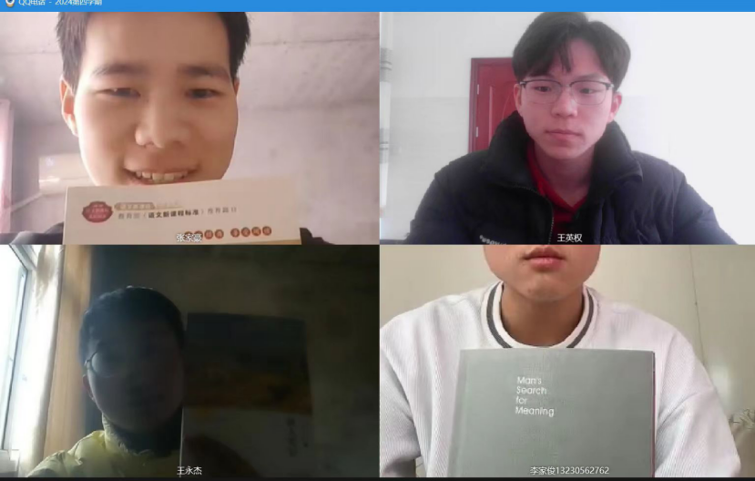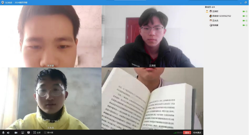 2024年2月2日,王英权小组进行第四周的读书交流分享小组通过线上QQ视频的方式开展了第二次的小组内读书交流的分享,由组长王英权组织,全体组员李家俊、张家豪和王永杰积极参与并分享心得。