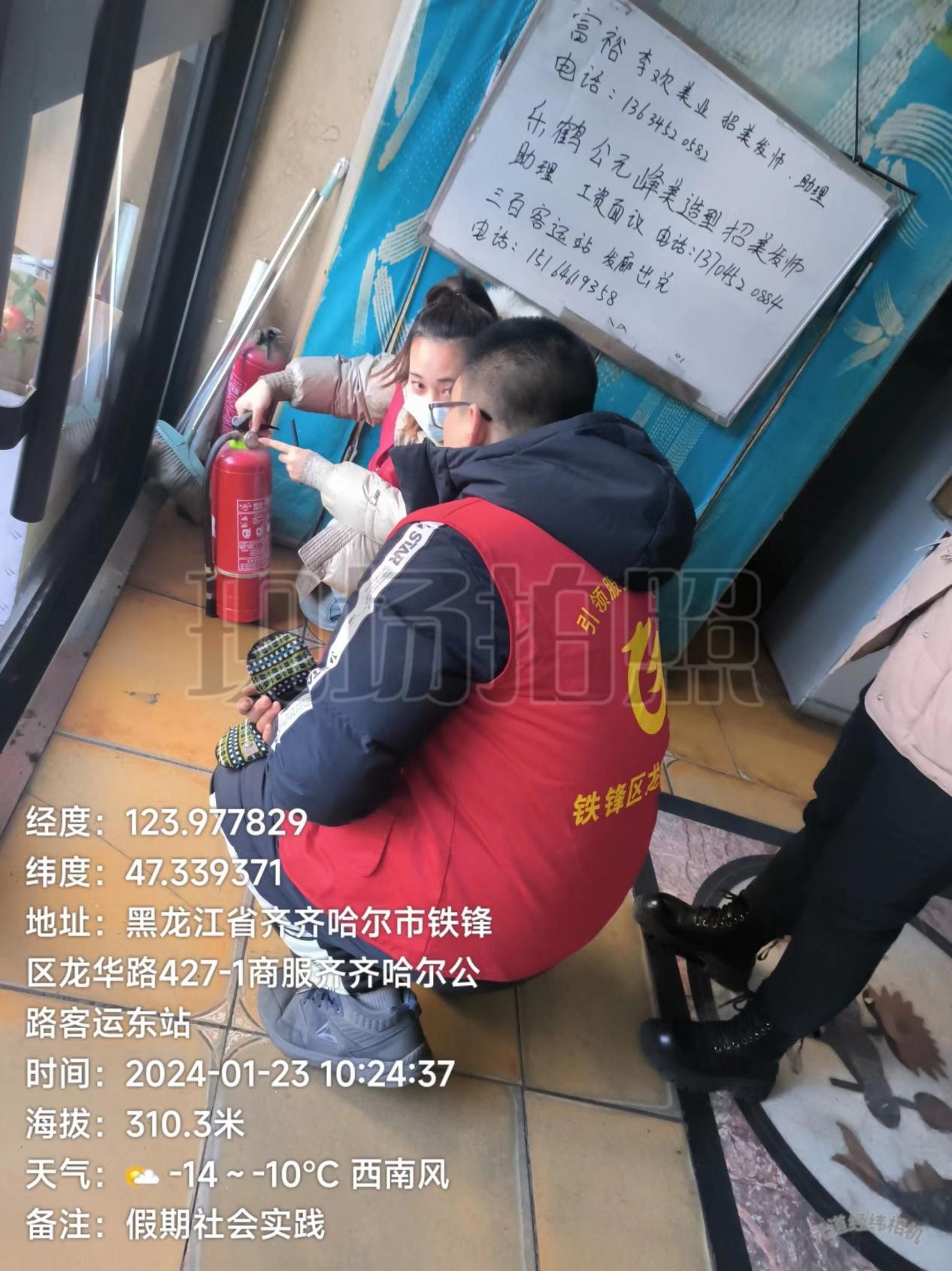 1月下旬,在铁锋区中东社区工作人员的带领下,肖哲维同学与社区工作人员对该社区沿街商家店铺进行走访检查。针对店铺内是否按要求配备了灭火器以及灭火器是否完好有效进行了排查,并针对排查发现的问题提醒商家及时整改,做到全民共同营造平安和谐的社会环境。
