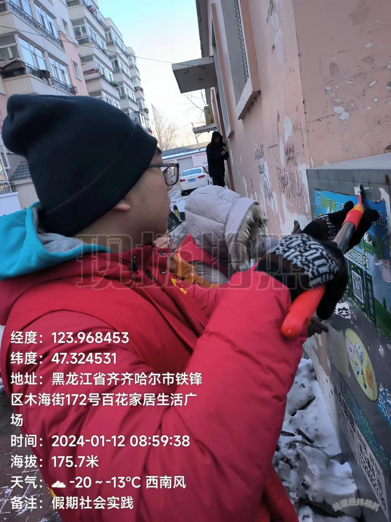 1月中旬,在铁锋区龙南社区工作人员带领下,肖哲维同学与社区工作人员深入龙南小区,对居民楼逐栋进行检查,将违规张贴的小广告进行了清理,很大程度上改善了社区环境。