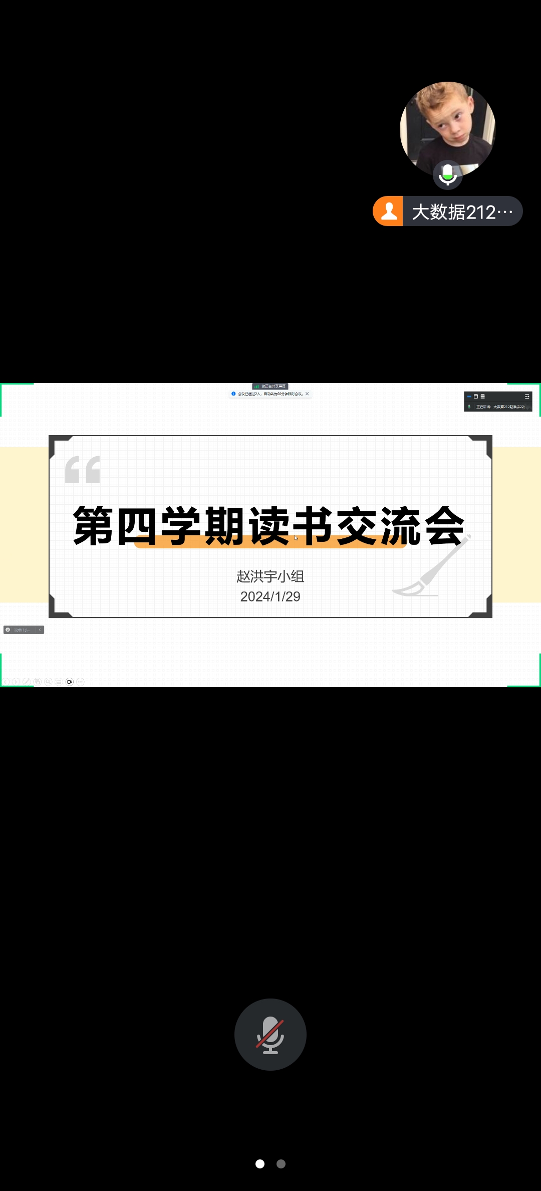 1月29日,SHSJ263小组通过线上腾讯会议的方式开展读书交流活动,由大数据212赵洪宇主持,小组成员共5人参加此次会议。