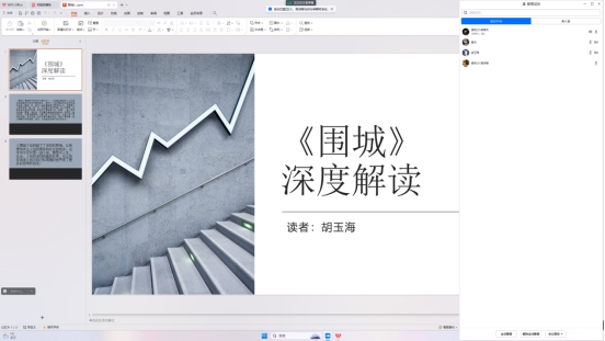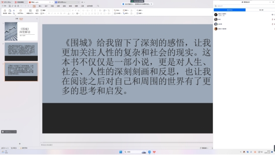 首先,组员胡玉海用《围城》为主题进行了读书心得交流。他认为作品所展现的对传统伦理道德的解构,以及对社会现实的精辟剖析。通过对主人公及其周围人物的生动刻画,小说引人深思,引起人们对自身处境和所在社会的反思。在幽默之中蕴含着深刻的社会批判,它以幽默讽刺的笔调,描绘了上世纪30年代上海的知识分子生活和精神困境。小说通过讲述主人公花心、特立独行的孙少平在感情与事业上的挣扎,以及他周围的一群形形色色的人,讽刺了当时的社会风气和官僚主义。整个故事充满了讽刺和幽默,既揭露了中国传统文化对个体人格的压抑,也批判了那个时代的伪君子现象。围城”的价值在于它永恒的主题以及对人性和社会的深刻剖析,它超越了时代局限,启迪人心。