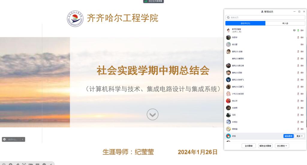 社会实践学期已开展过半,为更好的帮助学生完成社会实践学期任务,1月26日,纪莹莹老师组织学生开展社会实践学期中期总结会,21名学生参加。