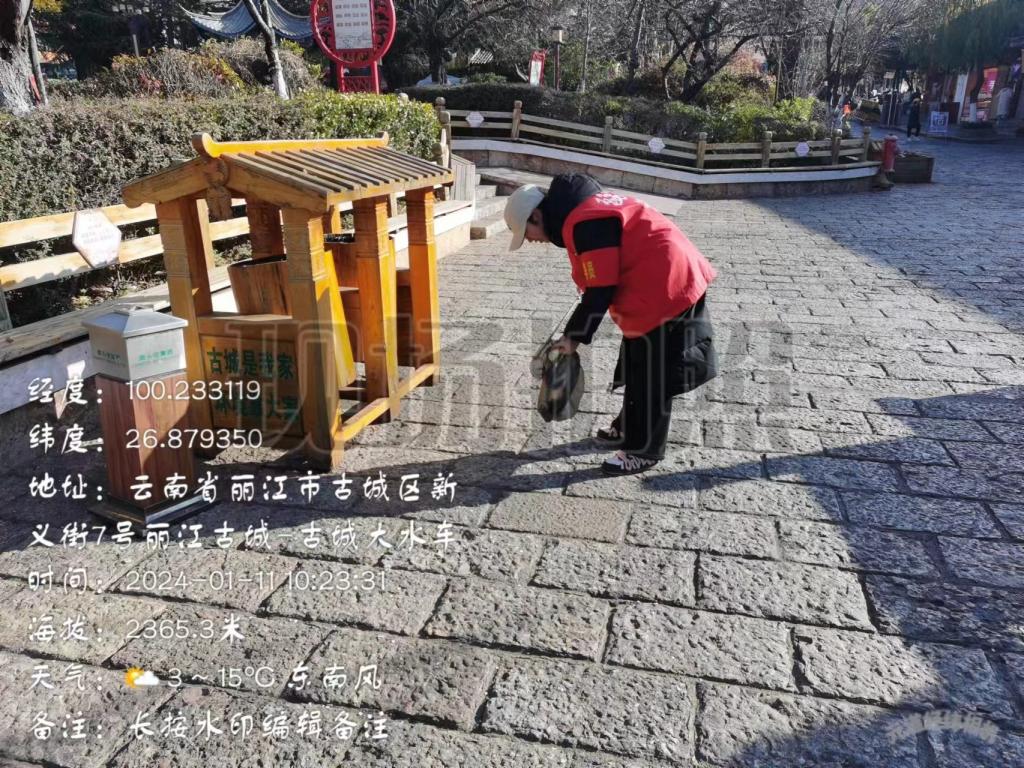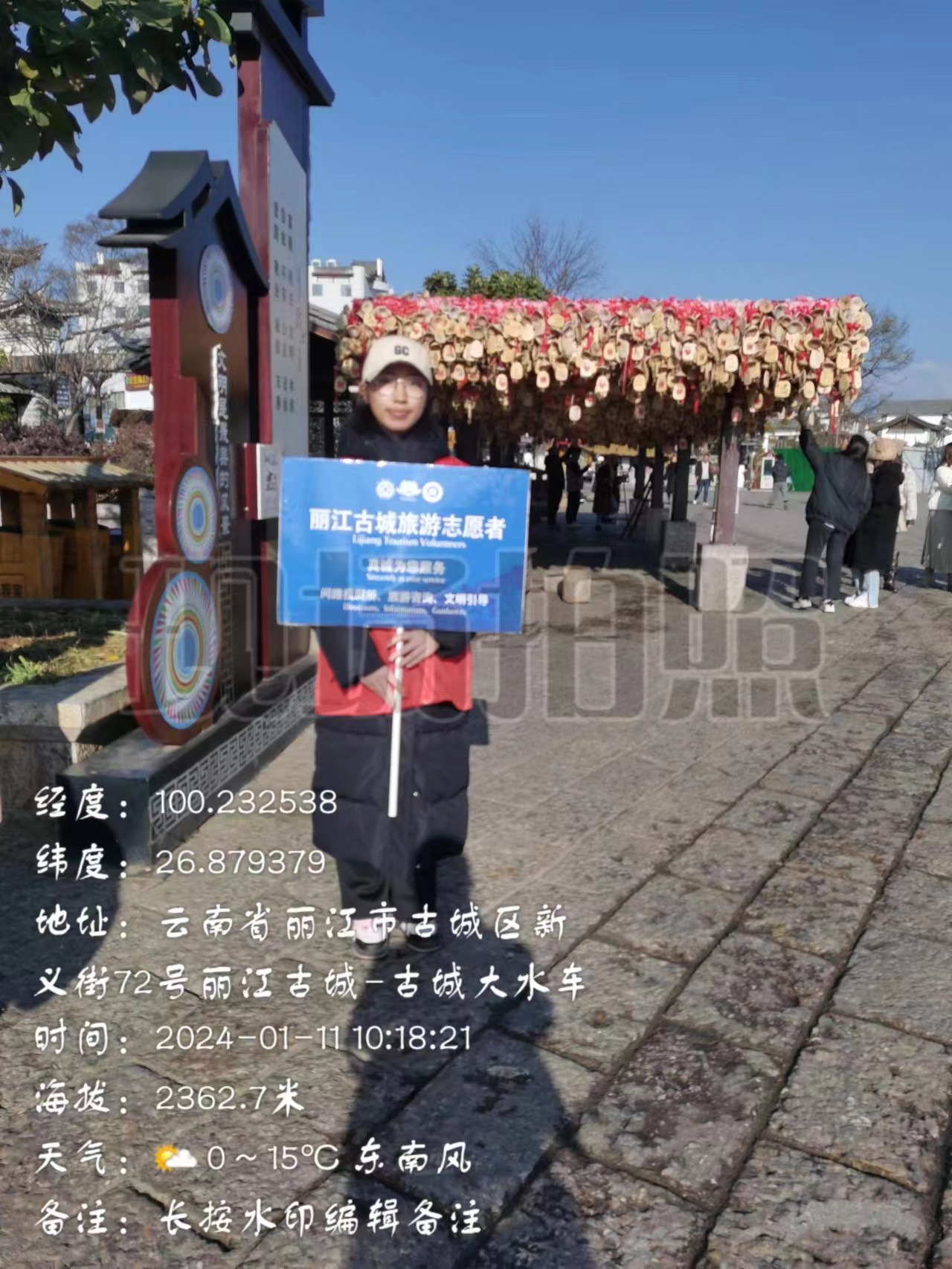1月11日,星期四,计科232蔡文婷在丽江古城玉河广场当了一名文明旅游志愿者,服务于美丽的丽江古城。