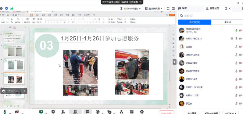 社会实践学期第一周总结会议于1月28日上午11点在腾讯会议举行,会议由动画专业刘沣元老师主持,共33名学生参加。