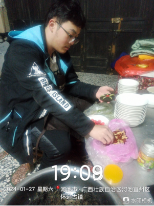 1月27号晚上,动画221班覃进宝在广西壮族自治区河池市宜州区怀远镇学习制作家乡菜。这次劳动给了覃进宝和他的家庭获得了充足的幸福感。