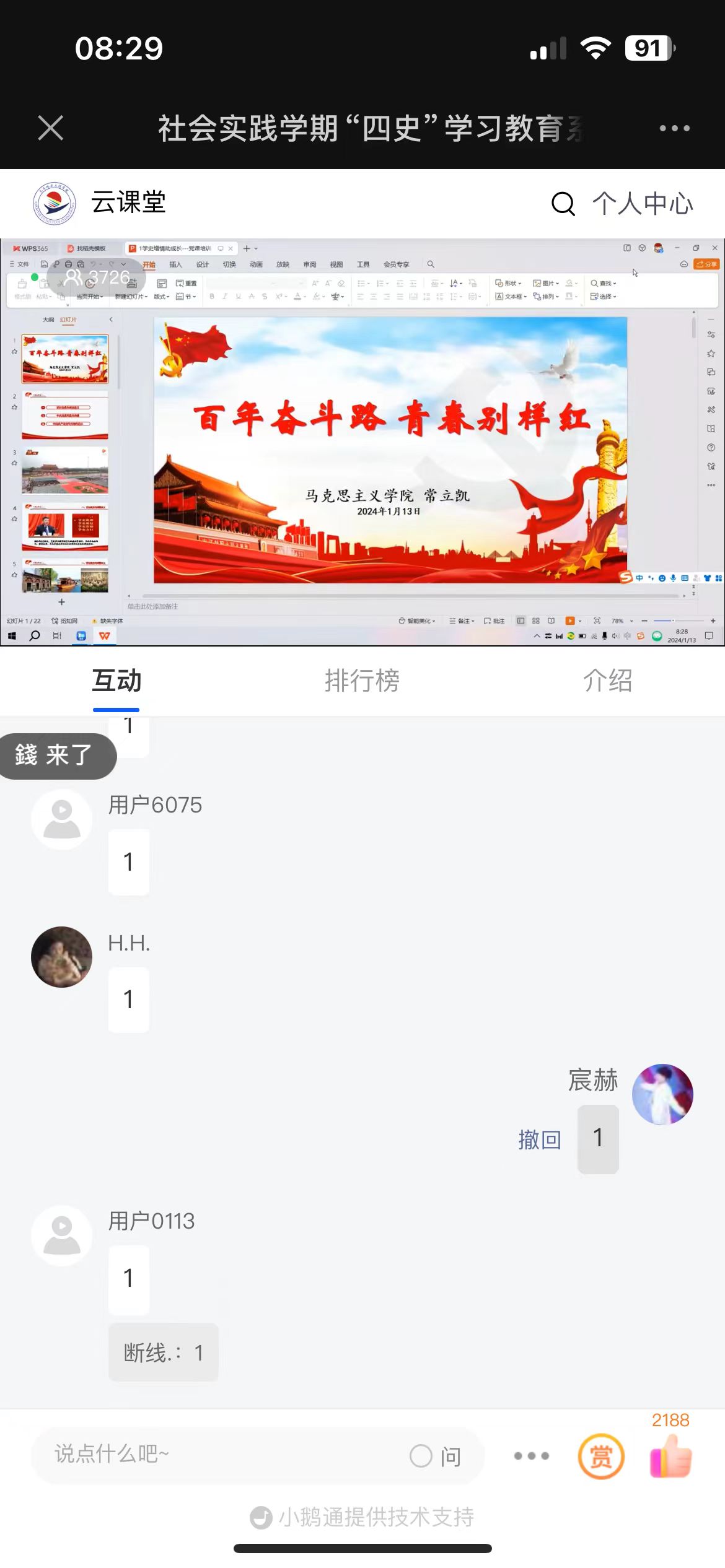 其次,SHSJ112小组成员计科221张宸赫发言,他在1月12日下午,恰好赶在学校开始寒假的前一天,他回到了他的母校齐齐哈尔市恒昌中学校,同老师和学生进行了深切沟通,表达了对班主任老师的感恩之情,并向学生讲述大学相关的事情勉励同学们认真学习。最后,张宸赫要感谢母校对他的培养和教育。在这里,他不仅学到了知识,还学会了如何做人。他会带着对母校的感激之情,继续前行,同时也祝愿母校的升学越来越好。