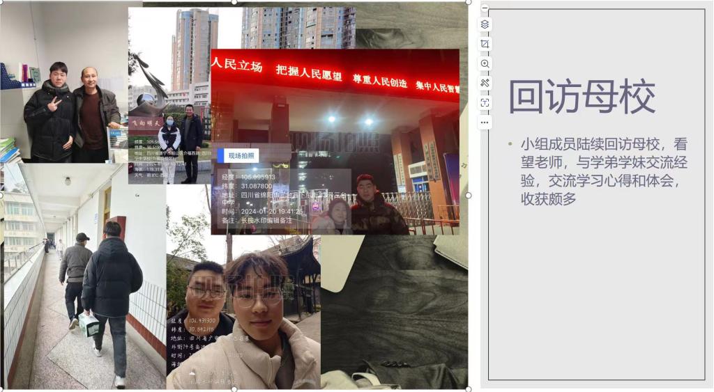 第二周内,首先,小组每名同学都准时完成学习任务,坚持打卡学习强国,让同学们都充分了解国家时事,提高自己的思想。完成每日一篇字帖,字帖可以书写实际书写能力,掌握钢笔行书的书写技巧,使书法水平在短时间内有一个明显的提高,为今后进一步学习打下坚固的基础。其次,全体组员同学这周统一完成了回访母校的任务。小组成员陆续回访母校,看望老师,与学弟学妹交流经验,交流学习心得和体会,收获颇多,提升了自我的能力,增长了经验,同时这也算是一种人生生活的更真实的体验吧。