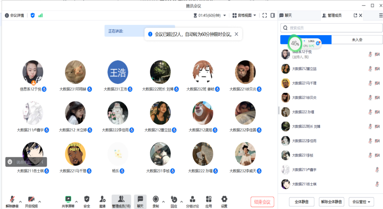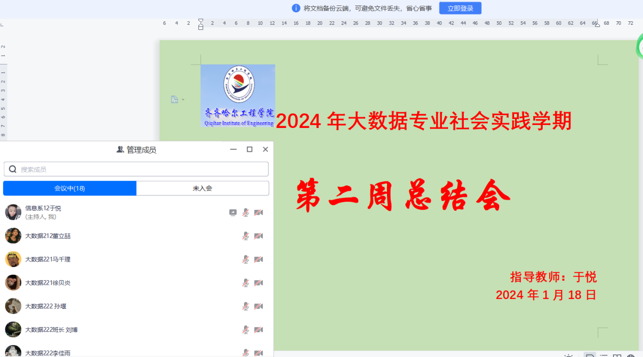 1月18日上午,信息工程系生涯导师于悦所负责的数据科学与大数据技术专业各小组在腾讯会议上进行了社会实践学期第四学期第二周线上周总结会,共有20人参加。