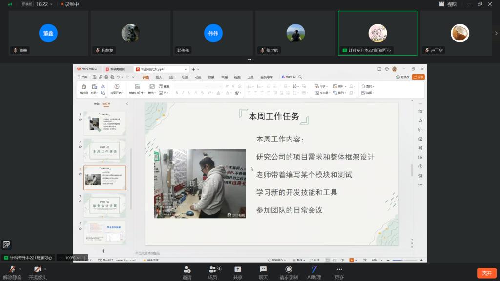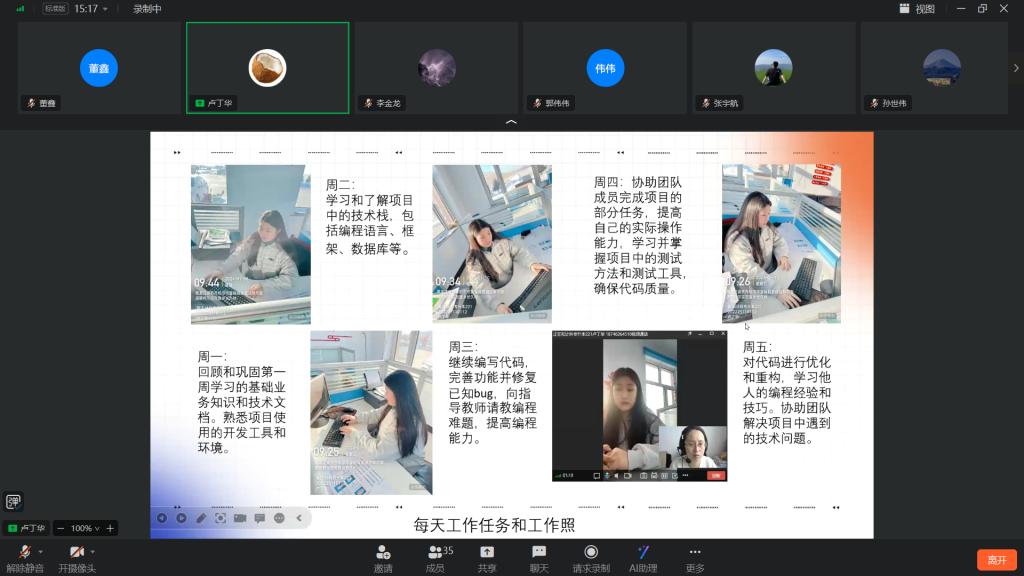 随后,学委张宇航纠正上传照片格式问题,并表扬本周同学们照片更加规范了;再次强调,要和指导教师视频通话汇报工作情况,并将截图上传到群在线文档重。