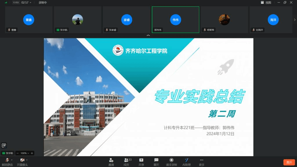 首先,学委张宇航介绍会序,组织尹智强、刘海洋、刘建华、于子航、孙世伟、李金龙、卢丁华、杨麒龙、崔可心、张晓锋、徐伟航、何金龙汇报第二周专业实践情况,12位同学从实践的内容、收获、不足和改进措施等方面进行总结。
