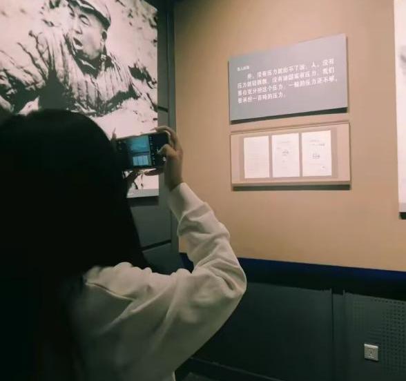在游览铁人纪念馆时,她被王进喜"奋不顾身压井喷"的图片所感动。唐朝诗人戴叔伦曾作诗:"愿得此身长报国,何须生入玉门关”。王进喜曾经发出“宁肯少活20年,拼命也要拿下大油田”的誓言,他把自己的一生毫无保留地献给了祖国的石油事业。