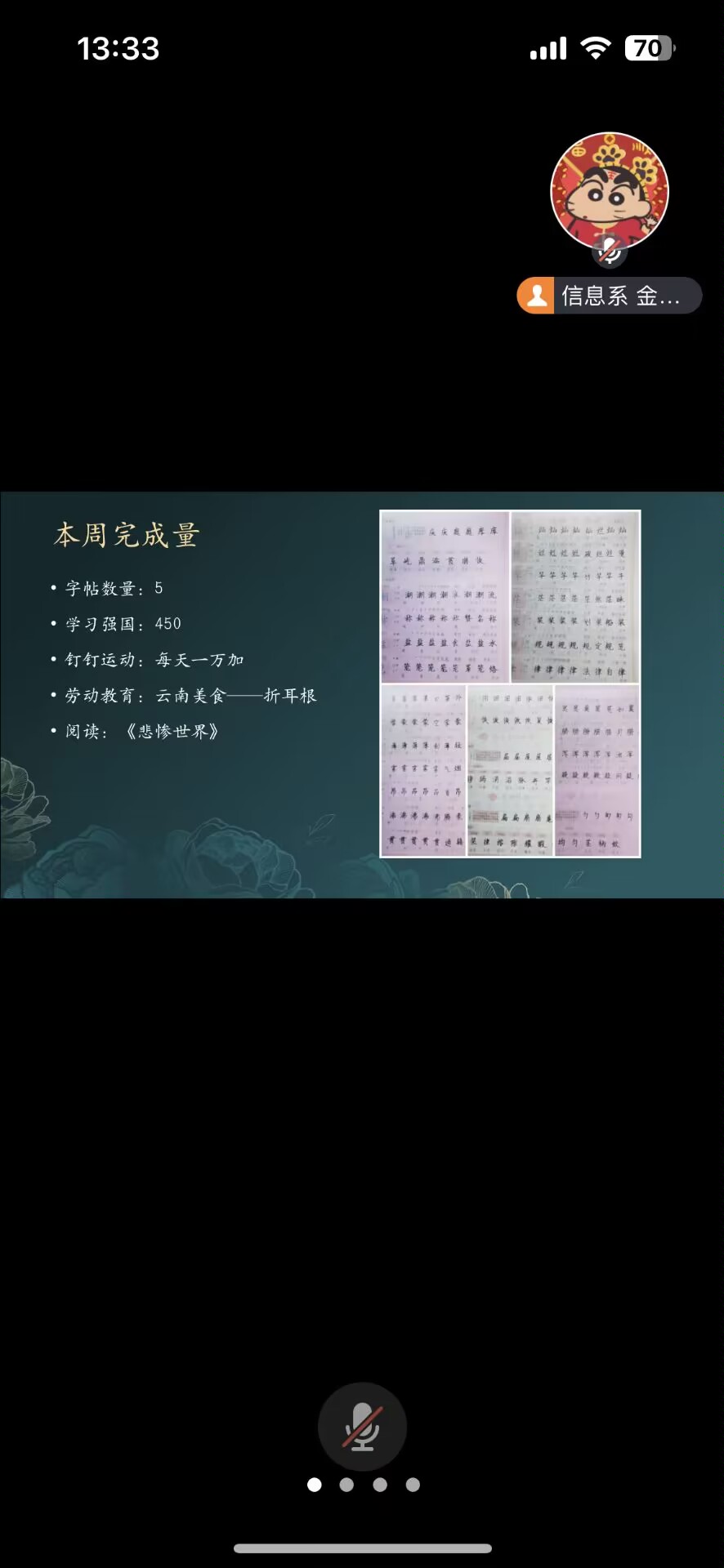 会上,金子涵老师就社会实践学期的重要性以及安全性进行重点说明,叮嘱同学们在认真完成任务的同时也要注意安全。其次,金子涵老师根据社会实践学期的主要任务以及手册安排,让同学们结合自己的实际完成情况进行汇报。汇报过程中,每位汇报人都展示了自己认真完成的各项任务,主要以读书交流、志愿服务、钢楷临摹以及居家锻炼等进行总结。