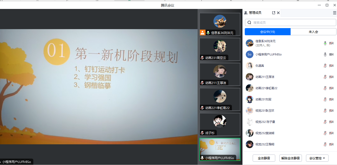 社会实践学期第一周总结会议于1月15日上午10点在腾讯会议举行,会议由动画专业刘沣元老师主持,共20名学生参加。
