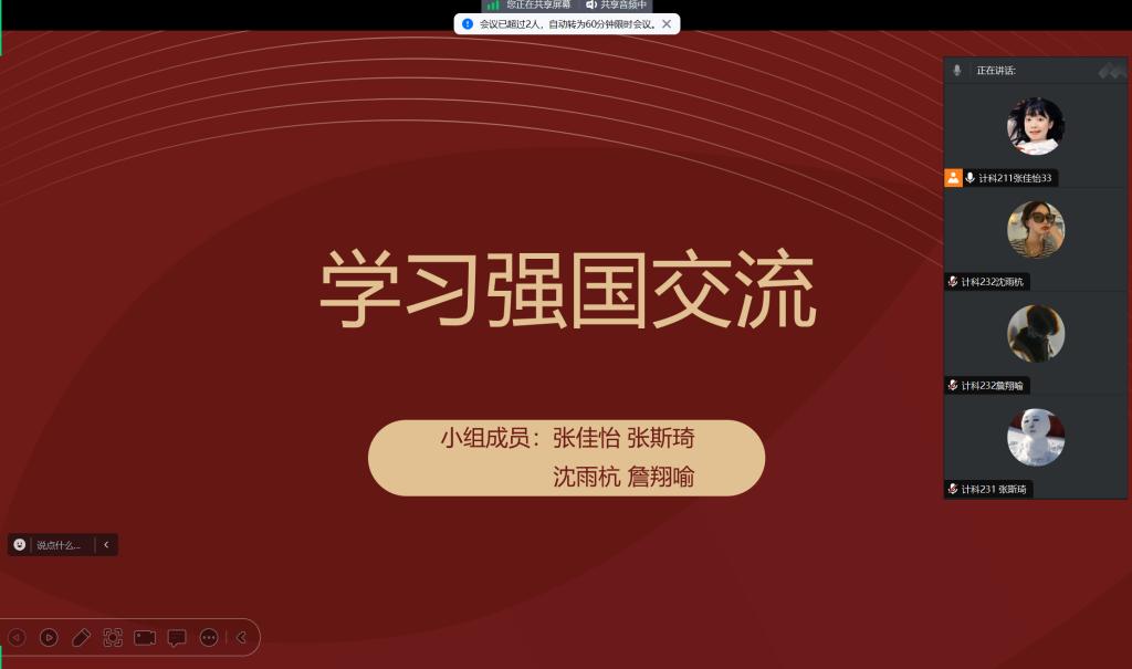 1月12日,张佳怡小组进行向上学习强国分享,组长张佳怡主持,组员张斯琦、沈雨杭、詹翔喻三人参加。