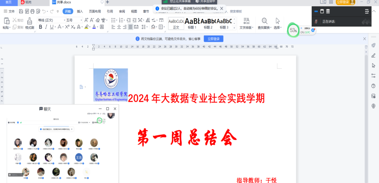 1月12日,于悦老师组织学生开展了社会实践学期第一周汇报,本次会议由于悦老师主持,共20人参加。