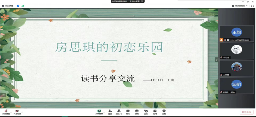 1月11日,通过腾讯会议我们开展了一场读书交流分享活动,本次交流分享让我们四人共聚一堂,分享了自己的读书心得。