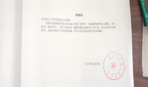 8月7日,杨子龙同学在桃铺摄影公司完成了专业实践学期实习活动。杨子龙同学在专业实践学期的实习期间,成功地获得了桃铺照相馆的表扬信,展现出了他在摄影领域的出色才华和专业素养。