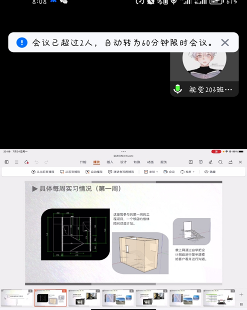 7月24日晚上,视觉传达设计专业203班指导教师王昀碧老师在腾讯会议召开视觉203班第六周总结会。本次会议由王昀碧老师主持,视觉203班全体成员参加。