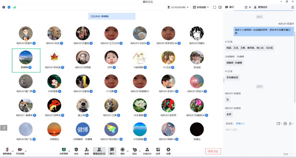 2023年7月21日晚8:30,主持人韩楠楠老师组织召开“第三学期第五周总结和安全教育班会”腾讯会议,电科201班42人全员参加。