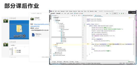 本次专业实践内容为Java开发方向培训,由北京九智云辉金牌讲师王军老师负责教学指导,王军老师有着多年从业经验,能完美把握就业发展趋势,教学风格风趣诙谐,教学方式为课上课下相结合,培养学生预习能力与课后复习能力,让学生能够学会学懂学通。此外,对于学生的问题也会不吝解答,深受学生爱戴。