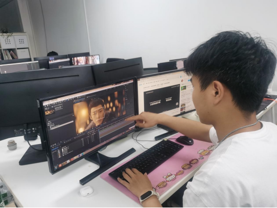 其次在实习时,他一直准时到达工作岗位,从不迟到早退。第一天的工作内容主要是企业指导老师带领他熟悉公司与实践内容,结识已在企业的前辈们,向他们了解熟悉工作等等。之后的实践他主要负责对宣传内容的拍摄,需要将准备好的道具或者角色进行全方位的拍摄,通过各个角度展现产品或角色的特点与细节,然后便是镜头语言的把控,如何通过运镜使拍摄的成品更加合理,好看;这都是他需要思考的地方。拍摄完成过后就是与指导老师商讨视频的剪辑流程与所需效果,需要将视频通过AE或PR等软件进行合成剪辑以及最后对剪辑好的视频做后期的处理,添加声乐,贴纸等等。