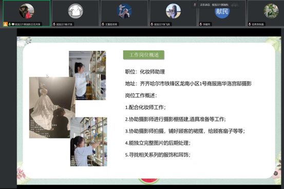 首先,张晶老师对专业实践学期的每天任务和每周成果进行了归纳和总结,生涯导师李献民和王慧茹老师为学生介绍职场经验,并提醒大家注意安全;其次,以各个实习单位为小组进行实习周汇报总结,施华洛小组学会跟妆、布光、摆姿势等婚纱摄影技能;异空间装饰公司小组学会量房和绘制CAD图,并参与业主开工仪式等。线上大家积极分享自己在工作中学习到的经验,同时也积极高效完成了公司给予的工作和任务,得到公司好评。