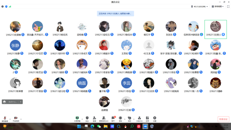 6月23日下午,计科213班在腾讯会议上开展“第一周优秀实习生评选”活动,本次活动是为了总结第一周实习情况,并对优秀实习生进行评选表扬,本次活动由计科专业辅导员薛苗苗主持,计科213班53人参加。