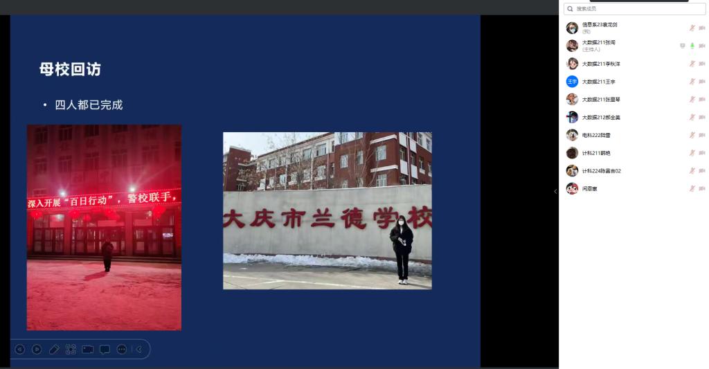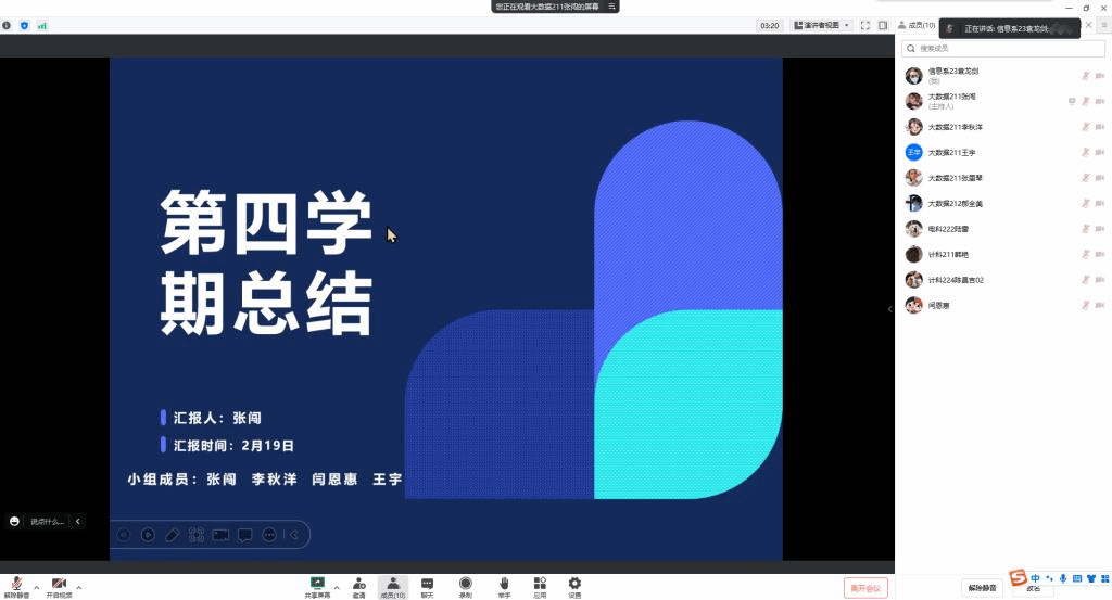 3月1日上午,指导教师袁龙剑通过腾讯会议召开了第四学期总结会,会议由袁龙剑老师主持,所负责的学生全部参加了会议。